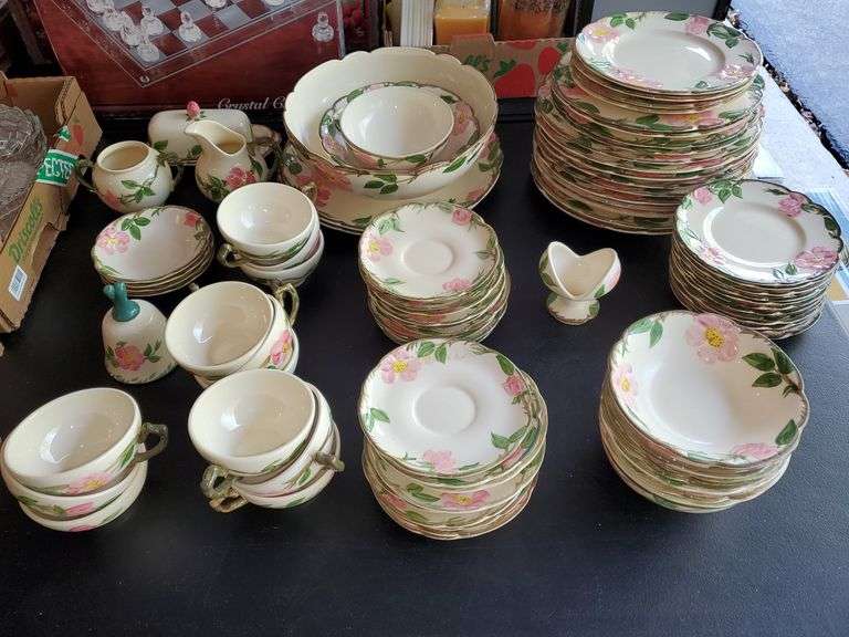LOT 256 - Franciscan Ware desert rose pattern includes (10) 10 and a half inch dinner plates, (4) nine and a half inch plates, (4) 8 inch plates, (12) 6 inch plates, (9) 6 in Super Bowls, (18) teacup saucers, (12) teacups, creamer and sugar bowl, (4) 5 inch berry bowls, butter dish, candle holder, bell, (2) 11 and 1/2 in serving platters, and a half inch serving Bowl, 8-in serving Bowl, five and a half inch serving Bowl.
