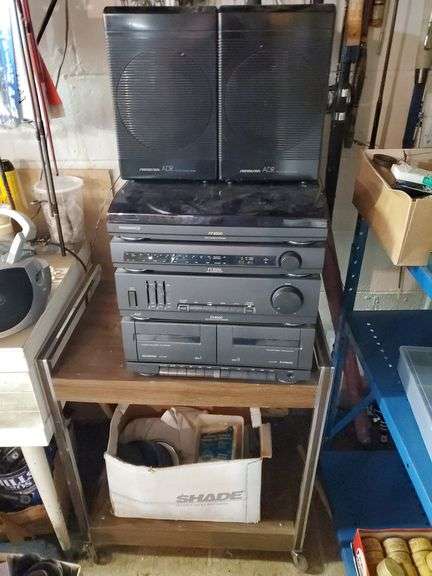 LOT 350 - Magnavox stereo system (FP 9300 turntable, FT 9300 AM FM stereo tuner, FA 9300 amplifier, cassette recording deck with sound design speakers, microwave cart, shop cloths.