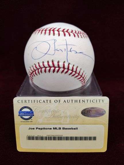 LOT 155 - Joe Pepitone autographed baseball. Blue ball point. Sweet spot. Rawlings OML Selig. Steiner hologram and CoA plus ball cube.