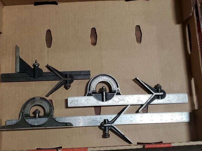 LOT 148 - (1) 8", (1) 12", (1) 18" combination square machinist protractors by Starrett and others.