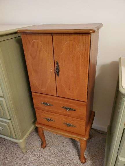LOT 31 - 17x40x13 Powell Mod 214 med color oak jewelry chest. (Missing one handle).