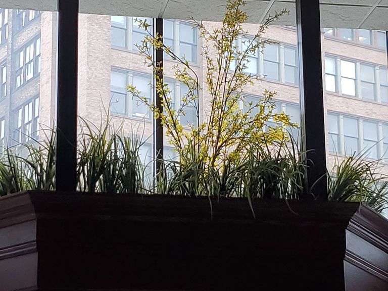 LOT 117 - (11) Large group of artificial plants You will need to bring a 10-12ft ladder to remove from above doorways.. This will be sold by the piece x11... The one in the main entrance is not to be removed