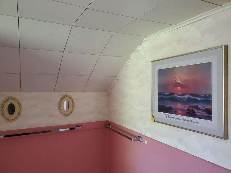 LOT 147 - Framed and matted inspirational print measures 18 in X 22 in, two matching accent mirrors measure 9 in tall by 7 in wide. Upstairs bathroom