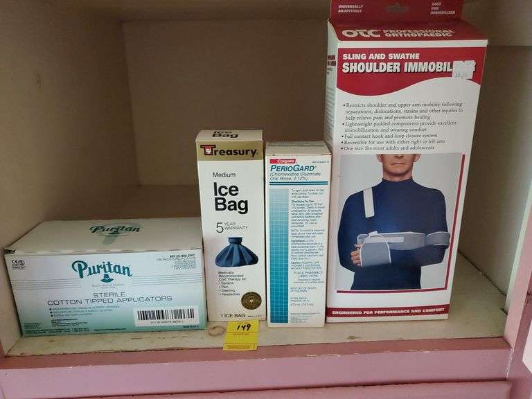 LOT 149 - Medical items including shoulder immobilizer, perioguard oil rinse, Treasury ice bag, Puritan sterile cotton tipped applicators. Upstairs bathroom