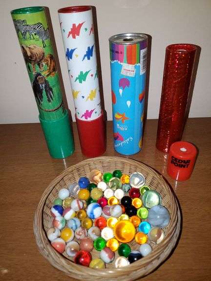 LOT 167 - Vintage marbles in basket, (4) children's kaleidoscopes, one novelty cedar Point fly eye. Upstairs bedroom two