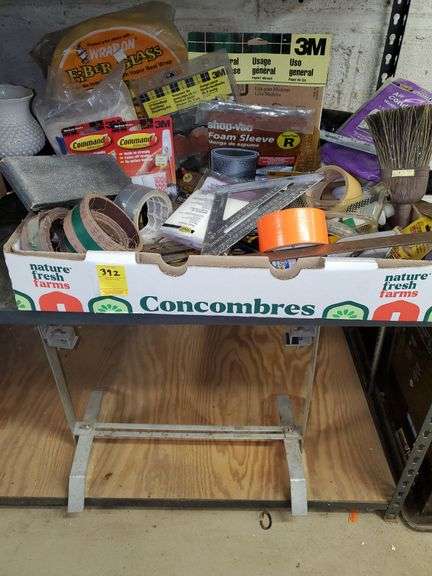 LOT 392 - Miscellaneous tools and accessories including 24-in framing square, speed square, 12-in square, 36-in metal yardstick, command hooks, sandpaper, duct tape, fly strips, whisk broom, sandpaper, shop vac foam sleeve, fiberglass vapor seal wrap, black plastic sheeting and metal bracket. See all photos. Workshop