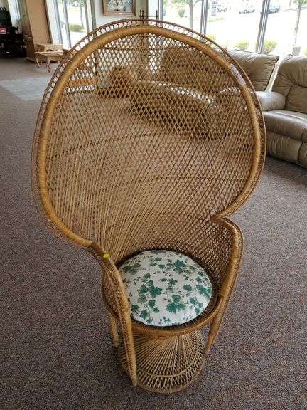 LOT 45 - Vintage wicker peacock chair stands 55 in H. Includes seat pad. Sign in room