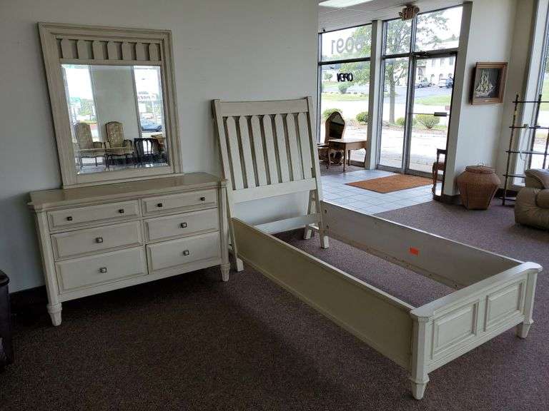 LOT 51 - A.R.T. Furniture twin bed frame and matching bevel edged mirrored dresser measuring 56 in W X 81 in H X 18 in D. Sign in room.
