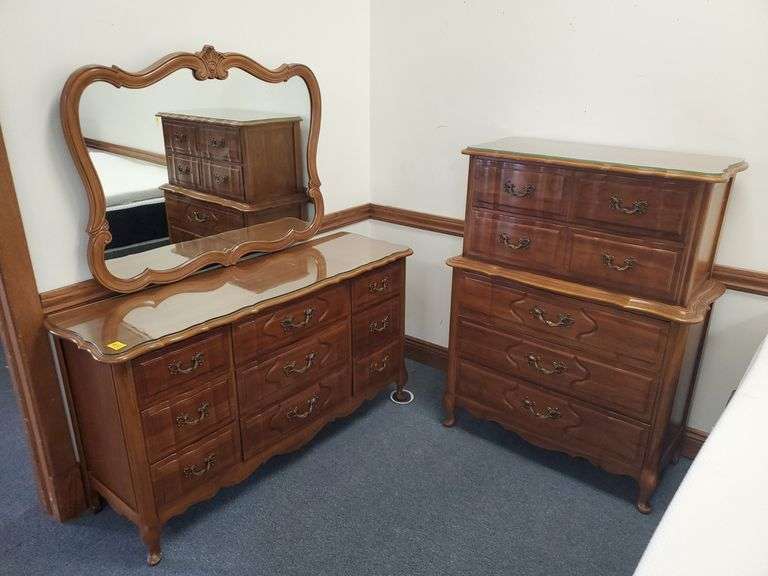 LOT 32 - 2 Piece Bedroom Set Mirrored Dresser (59"W x 19"D x 65"H) and Chest of Drawers (40"W x 20"D x 52"H) with Solid Brass Hardware, Queen Anne Legs, Glass Tops, and Fruit Wood Finish
