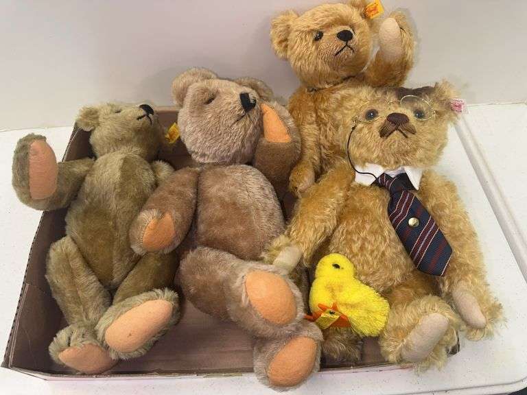 LOT 90 - Box of (4) Collectible Stuffed Steiff Bears and Steiff Chick
