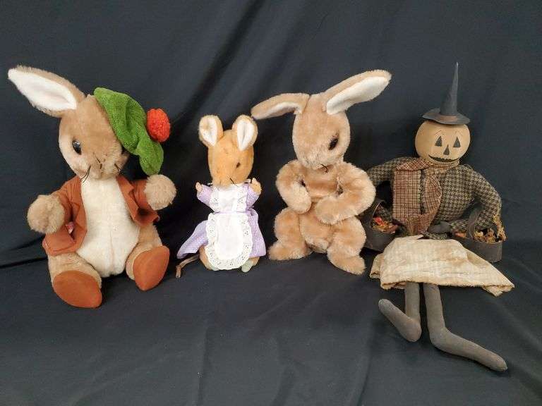 LOT 104 - (3) Eden plush dolls, two rabbits and one mouse, decorative jack-o-lantern doll.