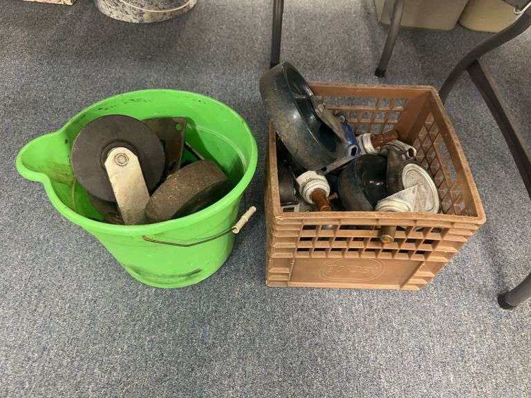 LOT 128 - Milk Crate and Heavy Duty Bucket full of assorted size casters