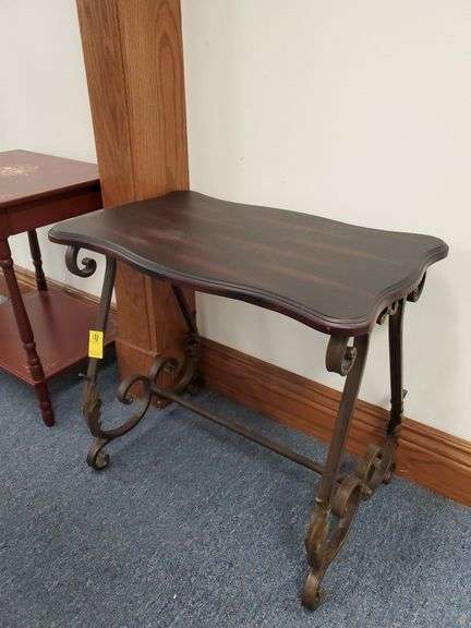 LOT 133 - Wood and scroll metal accent table measures 23-in x14 in x21 in.
