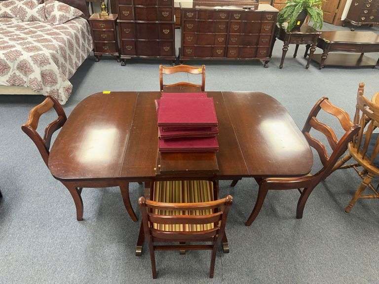 LOT 146 - Craddock Dining Set featuring Solid Wood Drop Leaf Table with Triple Pedestal Legs on Casters and (4)Ladder back Chairs with Striped Upholstered Seats. Includes (2) 11” Leaves and Table Covers. Table without leaves Measures 59”W x 38”D x 30”H