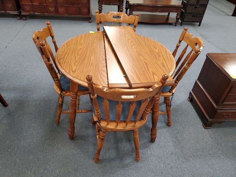 LOT 147 - Beech Brook 42-in round dining table, four matching chairs with blue padded seat cushions. Includes two 12-in leaves for 66-in width.