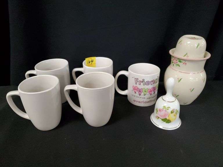 LOT 164 - Teleflora bedside tumble up water carafe, floral ceramic bell, ceramic mugs.