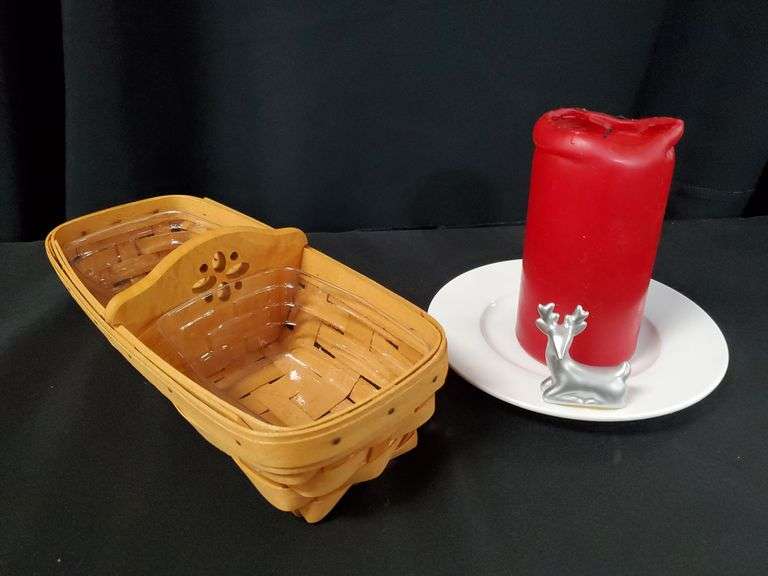LOT 167 - 1999 longaberger cracker basket with divider and plastic protectors, Yankee candle Company shimmering forest pillar candle plate holder, red pillar candle