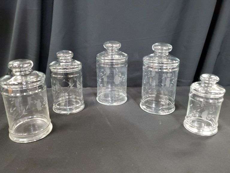 LOT 169 - (5) Collectible princess house etched glass biscuit/candy jars, (2) 8-in tall, (2) 7-in tall, (1) 5-1/2" tall.