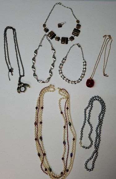 LOT 220 - Vintage Marvella four strand multicolored beaded necklace needs repaired need clasp enclosure .. vintage Avon lucite apple pendant rhinestones on gold tone chain..Cookie Lee owl pocket watch pendant on bronze tone chain... Two silver tone choker necklaces and other necklaces