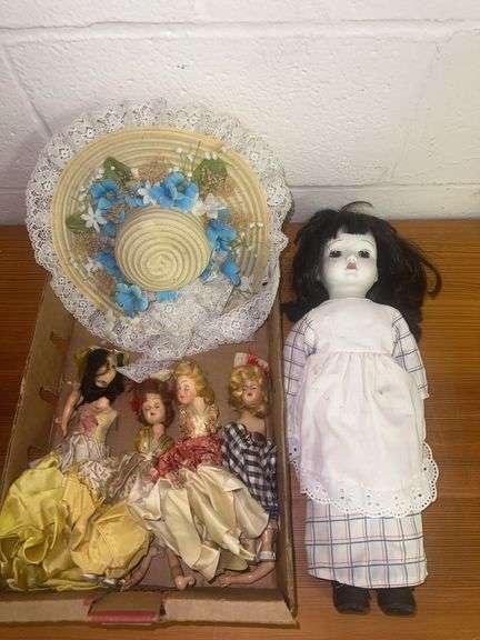LOT 190B - Box of assorted vintage dolls, some may need repaired. Includes decorative floral hat