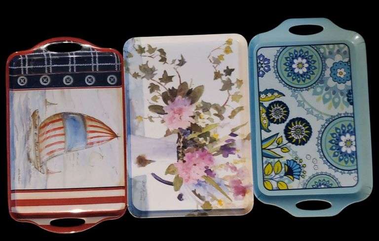 LOT 250 - Kate Miller McRostie Nautical Serving Tray Acrylic.. Judy Buswell Serving Tray Floral Bouquet Vintage 1994... Jennifer Brinkley acrylic blue flower serving tray ... Two orange cafeteria trays... See other pictures