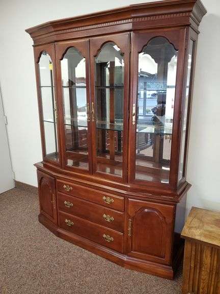LOT 15 - Bernhardt lighted china cabinet features beveled edged front door glass, mirrored back, solid brass hardware, East lake style accents on top. Cabinet measures 64 in W X 17 in DX 81 in H.