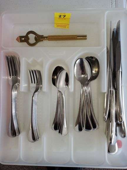 LOT 27 - Oneida stainless steel flatware with organizing drawer and bottle opener. Good service for six.