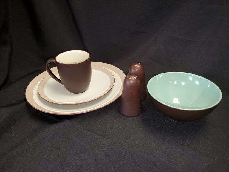LOT 39 - Noritake stoneware "Kona", 11-in dinner plates, 8-in bread plates, 7-in bowls, and coffee cups. 9 pieces of each. Matching salt and pepper shaker. (6) Costa Nova stoneware bowls with two-tone color brown and green.