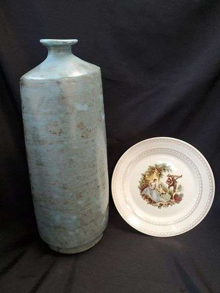 LOT 46 - Decorative ceramic vase stands 18 in tall, Sheffield USA American Limoges serenade plate with 22 karat gold accents.