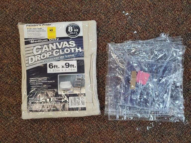 LOT 63 - New in package painter's pride medium duty canvas drop cloth 6 ft x 9 ft, plastic chair covers.