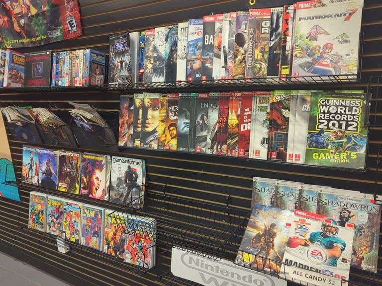 LOT 52 - Large wall grouping including VHS tapes, video, game guides, comic books, all for your bit. See photos. Fixtures not included