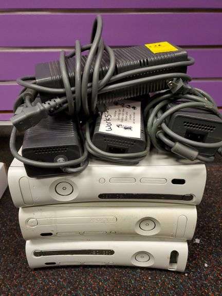 LOT 322 - Xbox gaming systems and power supplies. Condition unknown.