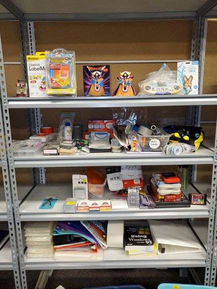 LOT 342 - (4) shelf lot including pocket pop keychain Friday the 13th, Disney tell a story, (1)dragon quest figurine by square enix and one in original box, vintage family feud game, Genesis bugs Bunny in double trouble game cartoon assorted hand tools including screwdrivers wire clippers, hammer and more, office items including folders binders scissors and more. See photos.