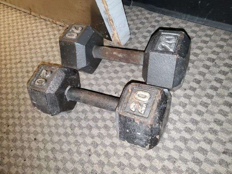 LOT 344 - (2) 20 lb cast iron dumbbells.