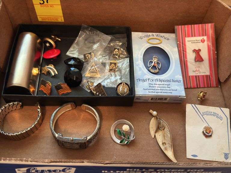 LOT 57 - Lot of pins and brooches incl Sterling pin with flower/leaves, GF leaf brooch, American Heart, flags, angels, lipstick case, etc
