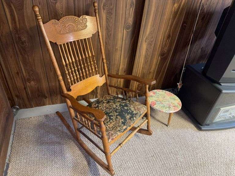 LOT 82 - Antique oak rocking chair and fabric top stool