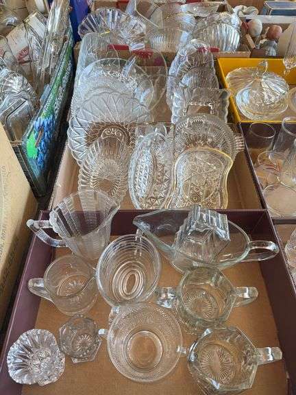 LOT 288 - Row including (3) boxes of glass serving dishes, candy bowls, candle holders, mugs, and more