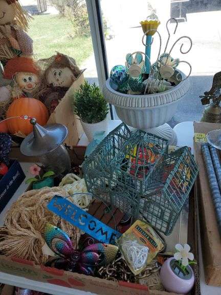 LOT 237 - Outdoor items including macrame hanging pot holders, extension chains for hanging pots, hummingbird feeder, decorative hanging bird cage, metal plant hangers, plant watering balls, earn planter and more.