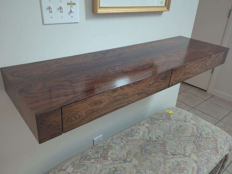 LOT 102 - 48x14 floating wood shelf with drawers. Bring your own tools to remove carefully.