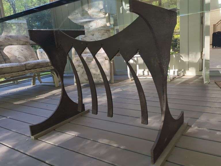 LOT 111 - Sculptural table by artist Coy Cornelius. Cut metal. Glass top. Measures 60 in. X 36 in. Small chip on underside. Inspect