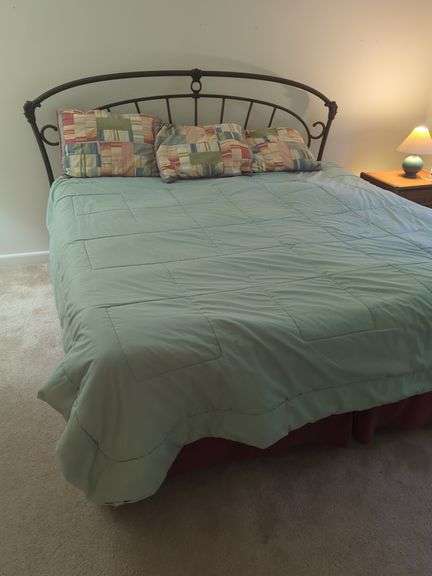LOT 129 - King size metal bed. Includes bedding and a Tempur-pedic mattress.