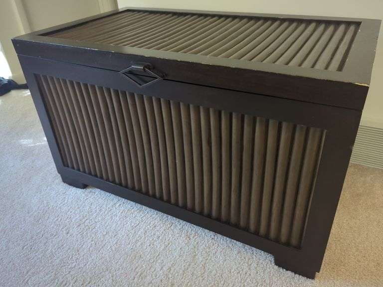 LOT 131 - 34x19x20h bamboo chest. Includes towels and king size bed linens