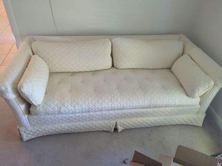 LOT 135 - Heritage Ivory quilt pattern. Low setting designer sofa. Comfy! 74-In x 36 deep