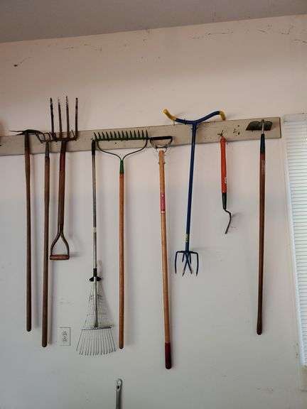 LOT 214 - Garden claw, garden fork, hose, garden weeder, garden rake, and more.