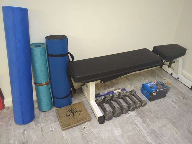 LOT 145 - Adjustable weight bench, yoga mats, 5, 8, 10 lb. Dumbbells. Ankle weights. All for your bid