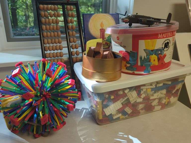 LOT 147 - Group of vintage toys including Mattel preschool. Tough stuff. Alphabet blocks, Legos, puzzle, abacus, Mitchell model airplane, small artwork on canvas candle