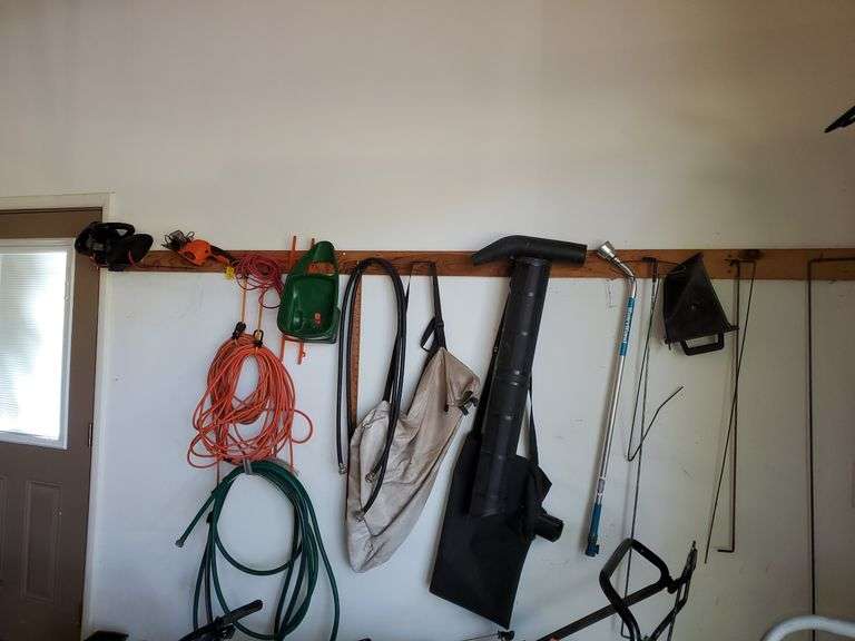 LOT 222 - Items along wall include 16-in electric Black & Decker hedge trimmer, Black & Decker lithium weed trimmer with charger, outdoor extension cords, vinyl hose, Scott's hand spreader, plant supports, outdoor equipment accessories for leaf blowers.