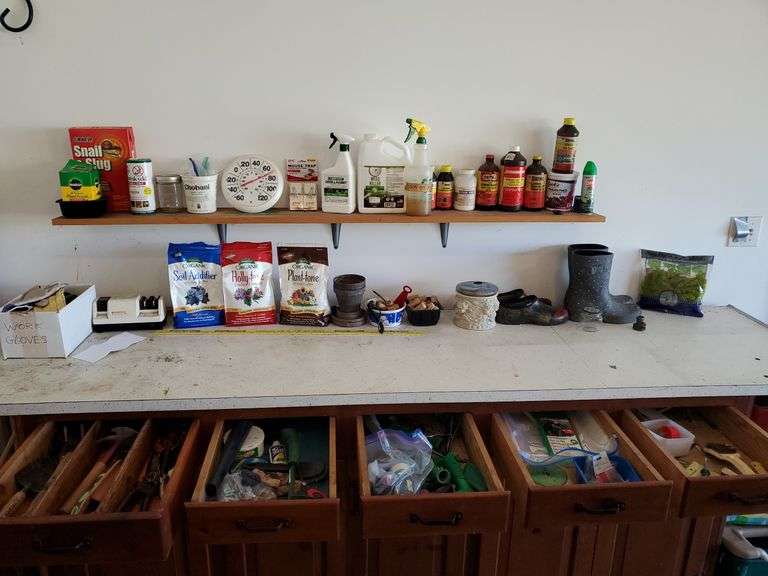 LOT 225 - Counter lot of gardening items including garden boots by Chooka, pesticides and fertilizers, thermometer, knife sharpener, garden gloves, planting pots, gardening hand tools and more