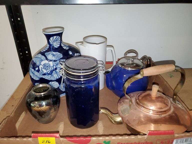 LOT 236 - Tea kettle, teapot, ceramic pitcher, Asian decor, blue glass jar.