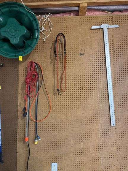 LOT 150 - Extension Cords, Bungee Cords, Drywall Square, and Large Christmas Tree Base